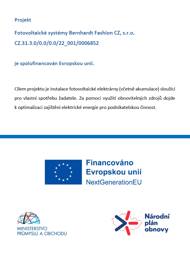 "Ministerstvo průmyslu a obchodu jako vlastník komponenty 2.3 Přechod na čistší zdroje energie Národního plánu obnovy (dále jen „poskytovatel dotace“) na základě žádosti o poskytnutí dotace přijaté dne 29.11.2022 v rámci Výzvy Fotovoltaické systémy s/bez akumulace I. výzva - aktivita a) (dále jen „Výzva“) rozhodlo dle ust. § 14m odst. 1písm. a) zákona č. 218/2000 Sb., o rozpočtových pravidlech a o změně některých souvisejících zákonů, ve znění pozdějších předpisů (dále jen „rozpočtová pravidla“), o poskytnutí dotace na projekt s názvem „Fotovoltaické systémy Bernhardt Fashion CZ, s.r.o.“, registrační číslo CZ.31.3.0/0.0/0.0/22_001/0006852 (dále jen „Projekt“)."